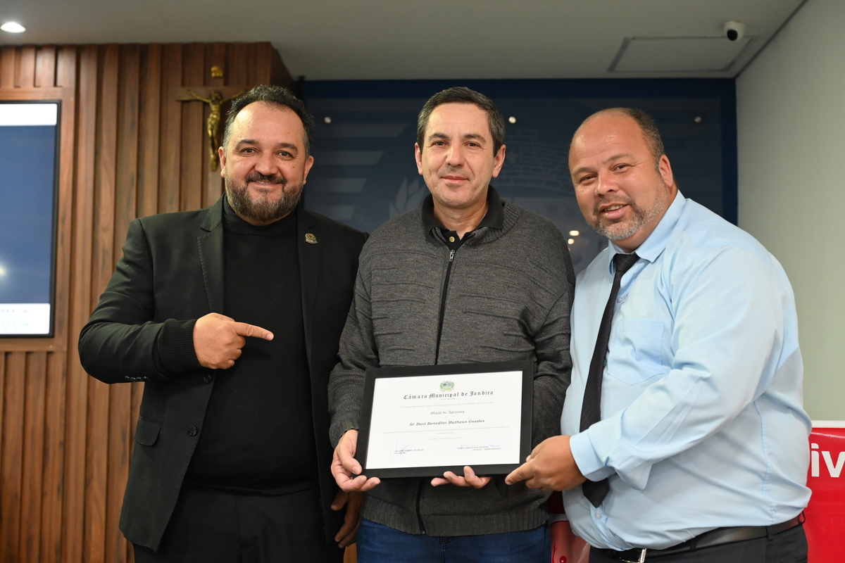 Hoje aposentado, o senhor Davi Benedito Matheus Guedes recebeu a homenagem na 33ª Sessão Ordinária, em reconhecimento aos anos de serviços prestados ao município; texto foi elaborado pelos vereadores Fábio Betera e Silvio Cabeleireiro